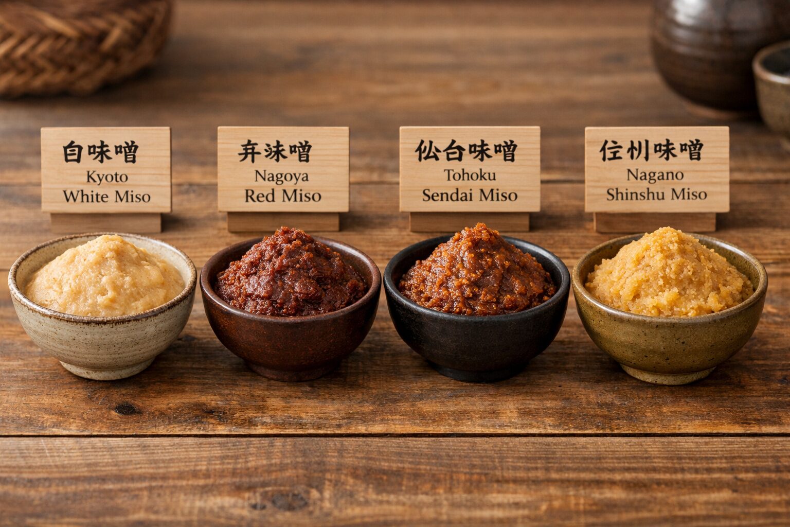 地域ごとの味噌の色と質感の違い。左から白味噌(京都)、赤味噌(名古屋)、仙台味噌(東北)、信州味噌(長野)。多様な味噌文化は、災害時の備えにも応用できる知恵の宝庫です。(イメージ)